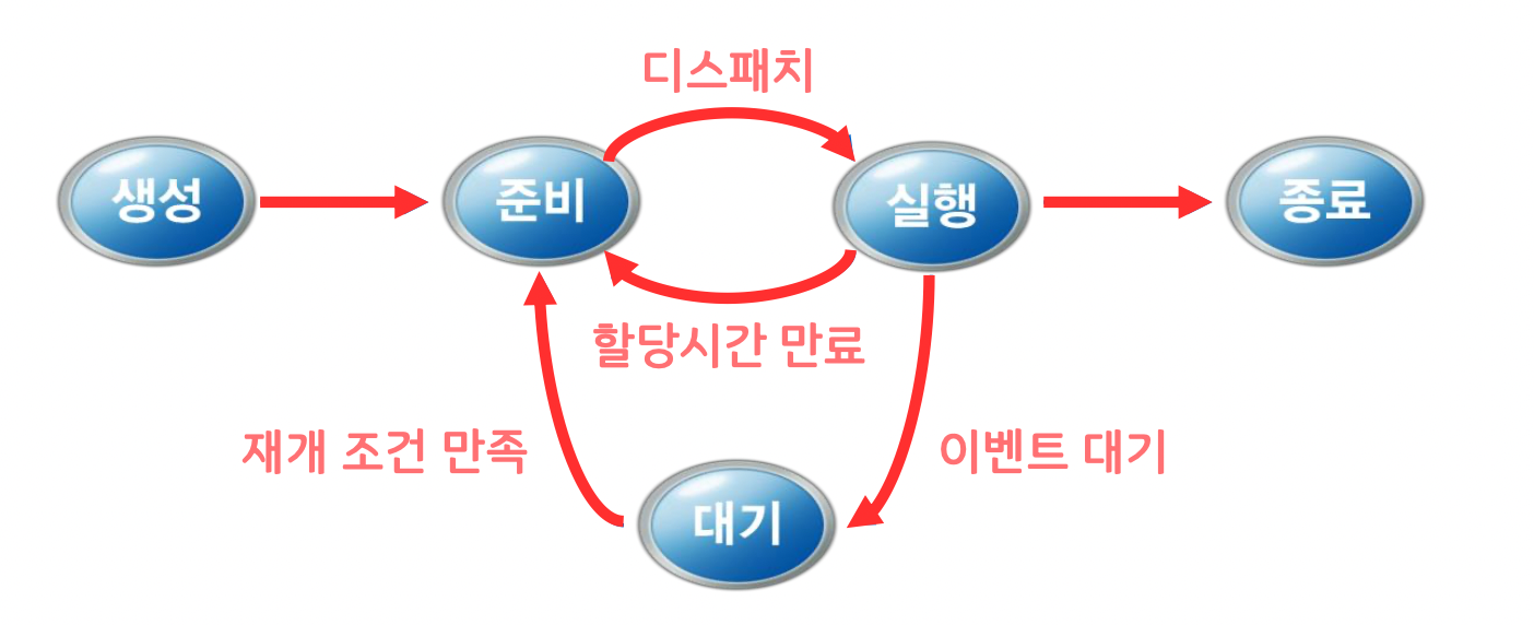 - ์ค๋น: ์คํ ์ค๋น๊ฐ ๋์ด CPU ํ ๋น์ ๊ธฐ๋ค๋ฆฌ๋ ์ํ
