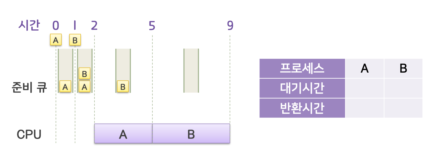 . A ํ๋ก์ธ์ค๊ฐ ๋๋ ์๊ฐ์ธ 5์ ์๊ฐ์ B๋ CPU์ ํ ๋น๋์๊ธฐ์ B์ ํ ๋น๋ ์๊ฐ์ 5.