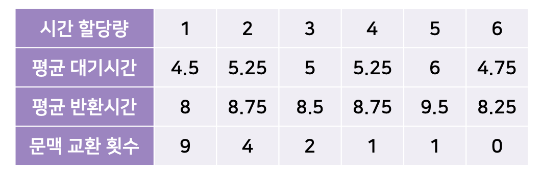 - ์๊ฐ ํ ๋น๋์ด ๋๋ฌด ํฌ๋ฉด FCFS ์ค์ผ์ค๋ง๊ณผ ๊ฐ์์ง