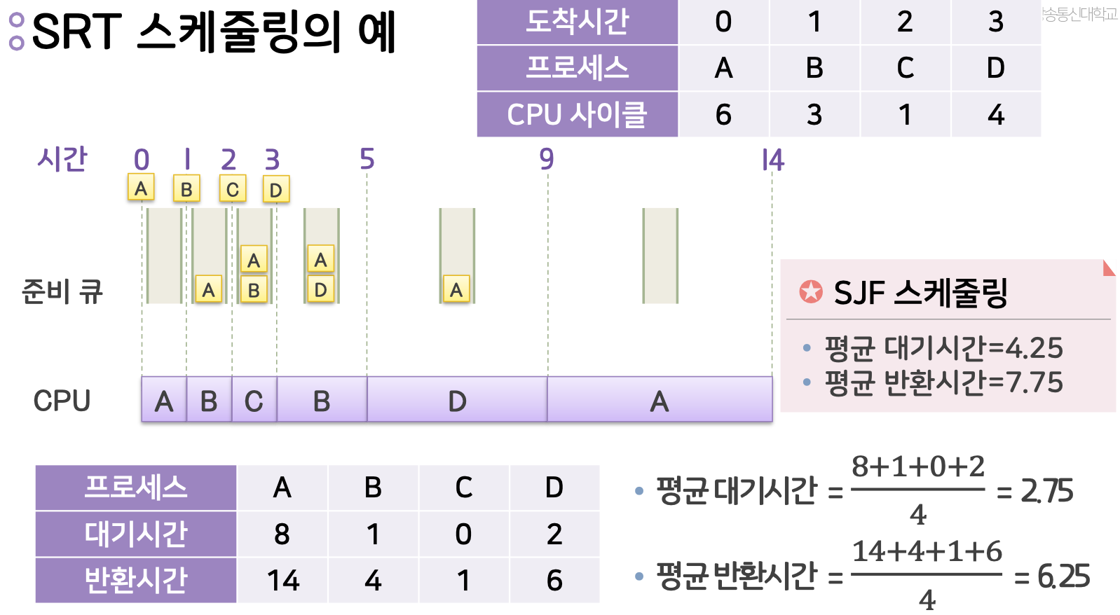 - ๊ฐ ํ๋ก์ธ์ค์ ์คํ์๊ฐ ์ถ์ , ์ ์ ์ ์ํ ๋ฌธ๋งฅ ๊ตํ ๋ฑ SJF๋ณด๋ค ์ค๋ฒํค๋๊ฐ ํผ