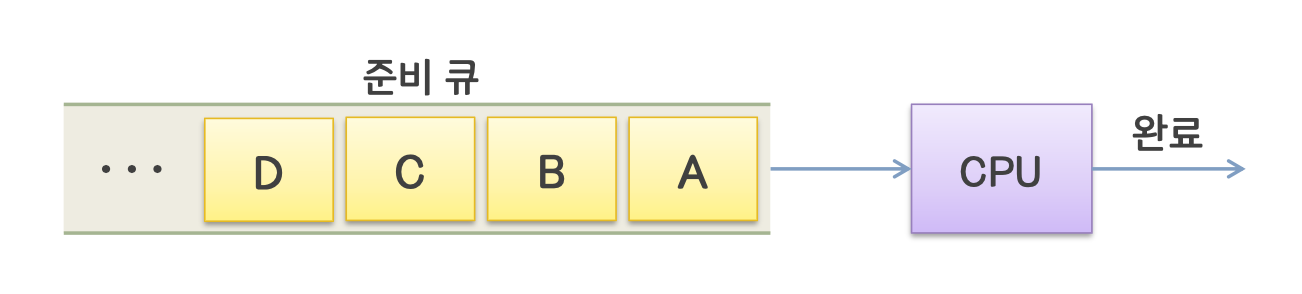 - ์ ๊ท ํ๋ก์ธ์ค๋ ๋จ๊ณ 1์ ํ์์ FIFO(First-In First-Out) ์์์ ๋ฐ๋ผ CPU ์ ์